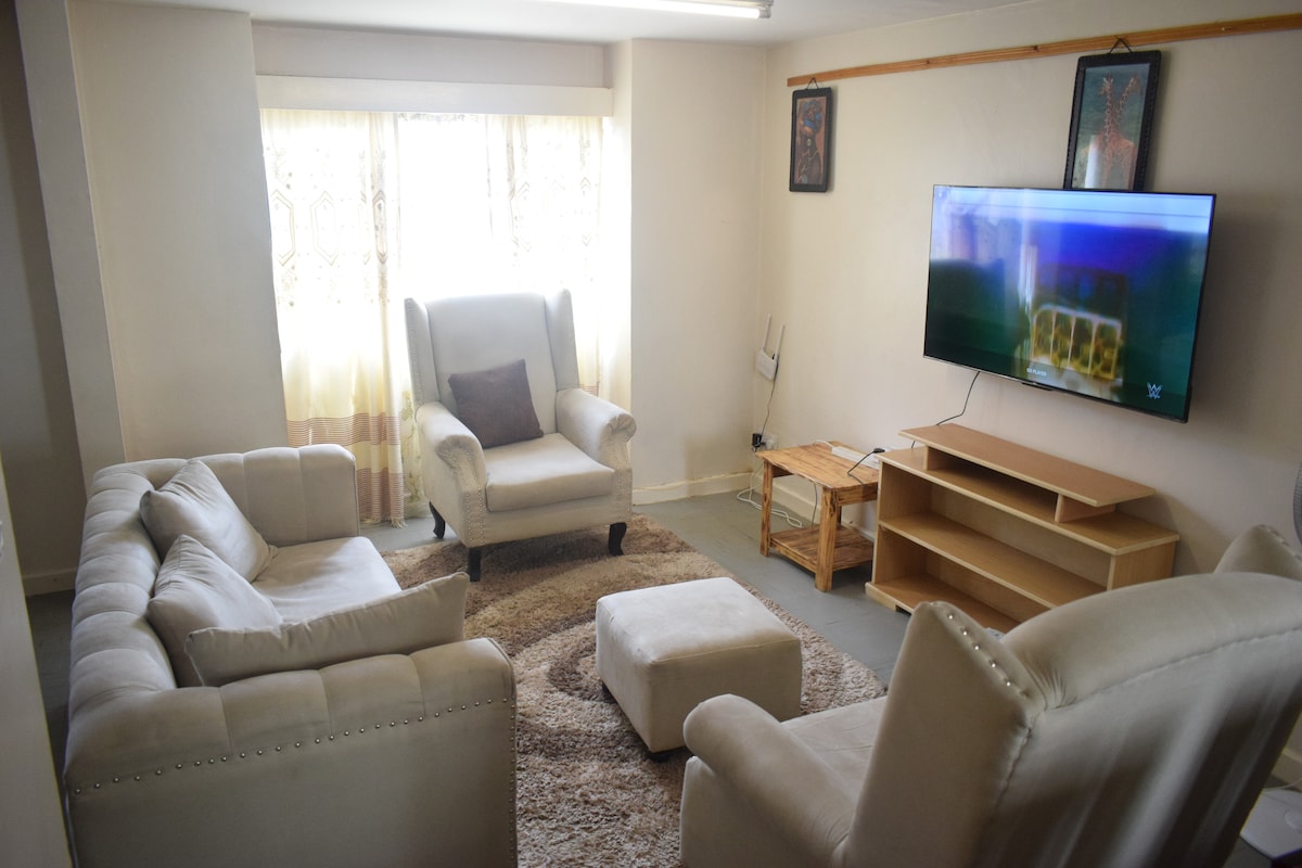 Una bonica casa rural d'1 dormitori totalment moblada i amb serveis situada als tranquils suburbis residencials de Kileleshwa. Té el seu propi pati privat per garantir la privacitat, i una sala d'estar, un menjador, una cuina, un dormitori i un bany. Hi ha televisor (55 polzades) amb Netflix, Prime Video i altres, wifi, una caixa forta i energia solar de reserva. També hi ha un televisor al dormitori. Servei de neteja. Està ben situat per accedir als principals llocs de Nairobi. Ideal tant per a estades curtes com per a estades llargues.