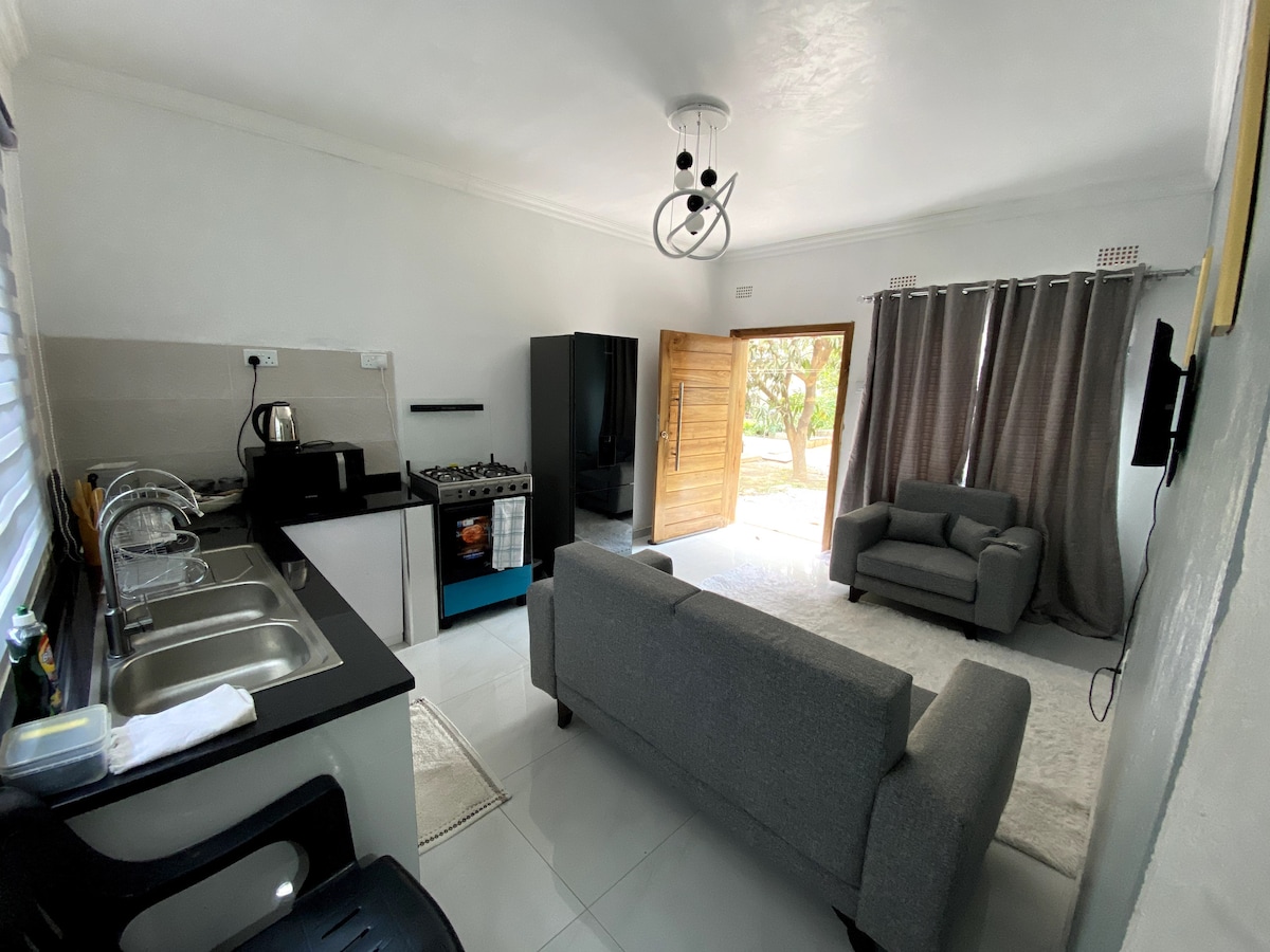 Casa privada de 2 dormitoris i 2 banys situada al cor de Rhodes Park Lusaka. A prop d'equipaments i serveis moderns, com ara centres comercials, restaurants, cafeteries i a 10 minuts del districte financer. Pot allotjar fins a 4 persones. La casa té un bany privat i un bany principal Pati tancat privat i un jardí establert més gran per gaudir. Aquest allotjament és perfecte per a viatgers de negocis i famílies. Apte per a estades llargues