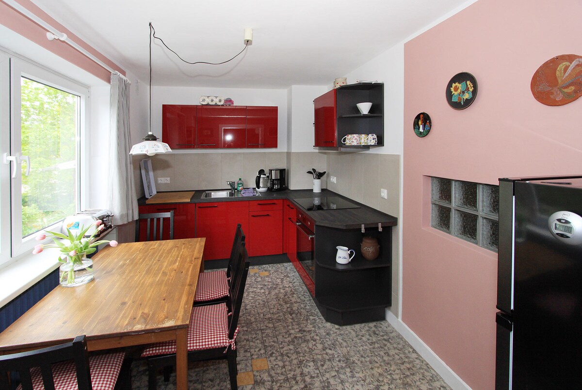 Benvolguts hostes: Nosaltres, una família de quatre persones amb un gos, tres gats i gallines, estem encantats de donar-te la benvinguda al nostre pis "Hunnkuhl". L'apartament es troba a la casa adossada on vivíem en una ubicació tranquil·la al final d'un carrer sense sortida. Es troba a la planta baixa i a la planta superior i ofereix uns 43 metres quadrats d'espai per a 4 - 5 persones. A més, hi ha una àmplia terrassa amb vistes al jardí idíl·lic. Esperem que et sentis com a casa amb nosaltres!