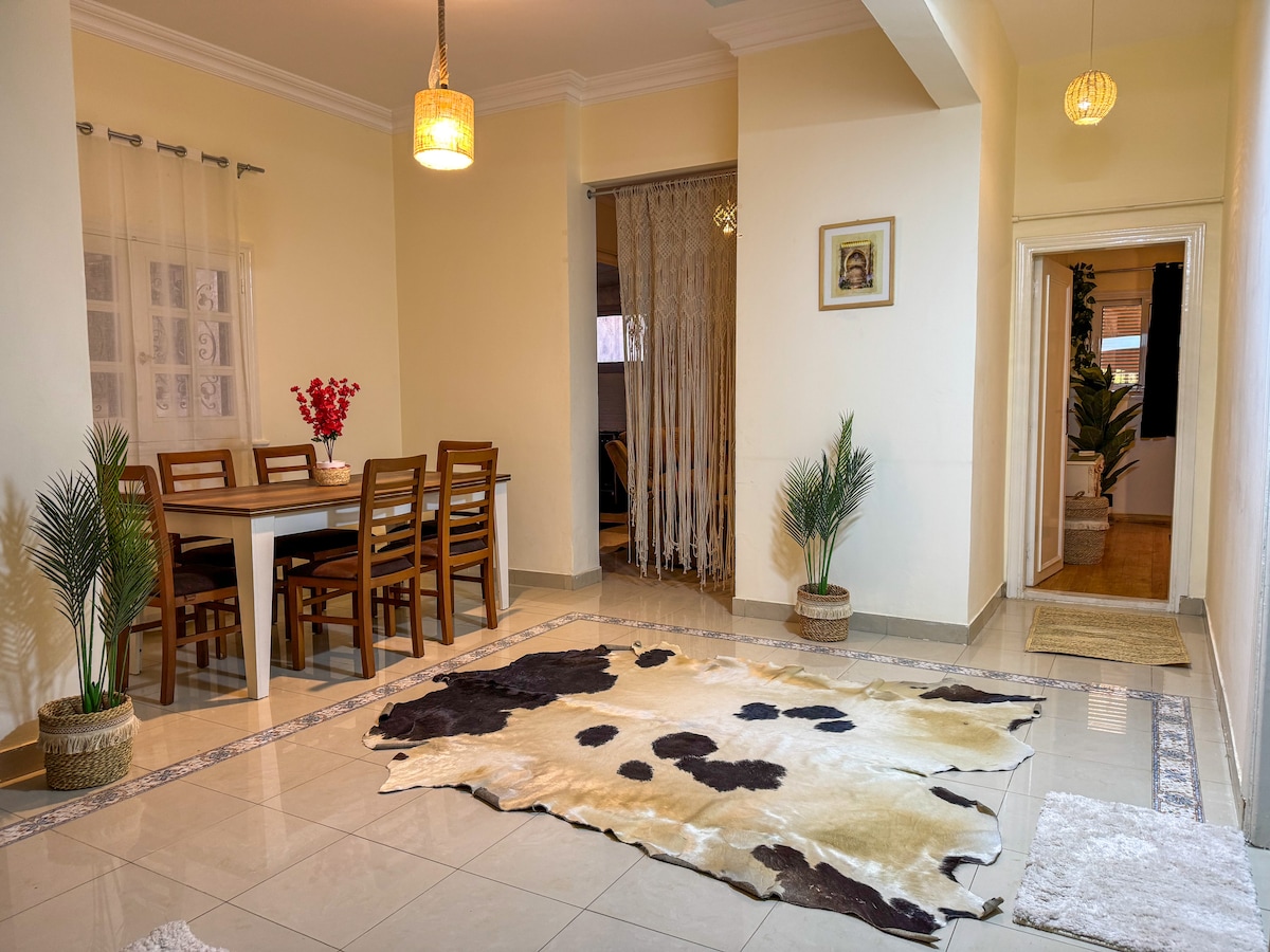 All about calm, simple moments: the patio is quiet and shaded by trees, with a lemon tree that fills the air with a soft, fresh scent. It’s a space we love for slow mornings, afternoon reading, and unwinding in the evening. Outdoors, you’ll also meet Pepsi, our black balady dog. She lives in the building, shared outdoor area. this home offers a break from Cairo’s noise while still being close to everything you might need. It’s not a hotel—it’s a place meant to be lived in, rested in, and felt.