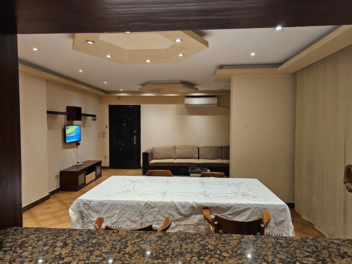 Apartament amb jardí net i espaiós en un barri segur i exclusiu. Perfecte per a famílies! Disposa d'una gran recepció, aire condicionat a tot arreu, llit king size al dormitori principal i 2 llits individuals (i un llit inflable) al segon dormitori. Els serveis inclouen televisió per satèl·lit, internet d'alta velocitat, espai de treball exclusiu, cuina TOTALMENT equipada, terrassa al jardí i plaça d'aparcament. A prop del Maadi Grand Mall, restaurants, supermercat, bancs i carreteres principals. Accés fàcil a llocs turístics (piràmides, Museu del Caire, Ciutadella).