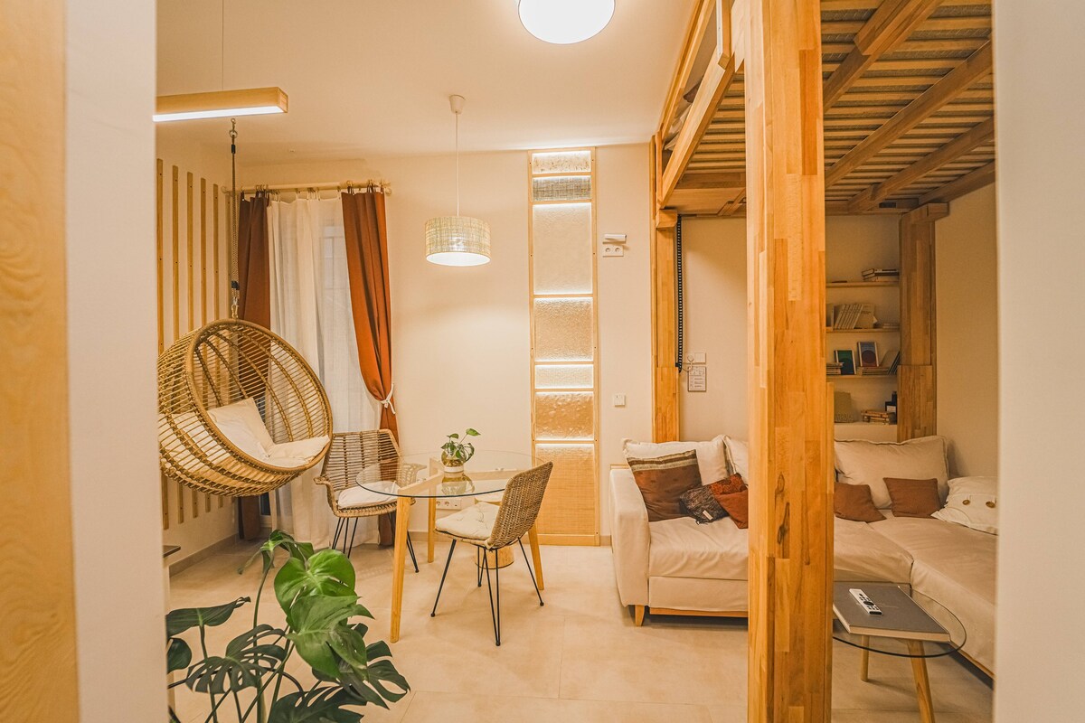 Estudi de disseny situat a 3 minuts a peu de la Puerta del Sol, i a 2 minuts de la Plaça de Santa Ana. L'espai té un llit doble gran situat en una plataforma motoritzada, un sofà llit convertible amb chaise longue, una taula de menjador amb 3 seients, una butaca penjant, una cuina totalment equipada i un bany privat a la suite. L'estudi està equipat amb un projector amb accés a Amazon Prime Video, mode de televisió i la possibilitat de connexió sense fil o HDMI.