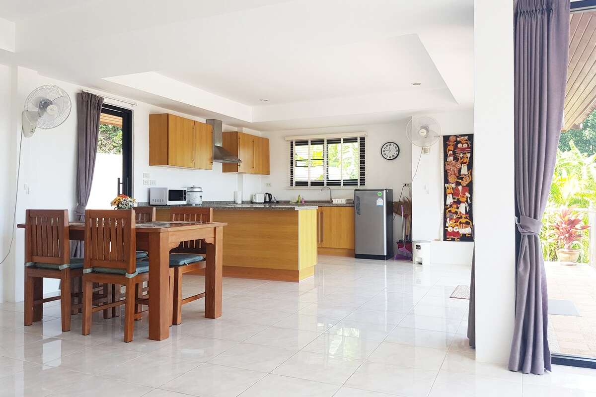 Desconnecta en aquesta vil·la privada única. Gaudeix de les vistes panoràmiques al mar i a les muntanyes des de la piscina, la terrassa i el jardí exuberant. La vil·la està situada en un petit turó al poble de Maenam, un lloc només per a locals amb un bulliciós mercat nocturn i una llarga platja de sorra. Tot i que els restaurants i les botigues estan a només cinc minuts en cotxe, la vil·la sembla tranquil·la i aïllada. La vil·la té wifi ràpida, cuina totalment equipada, 2 dormitoris amb banys adjunts i una àmplia superfície total de 200 metres quadrats.