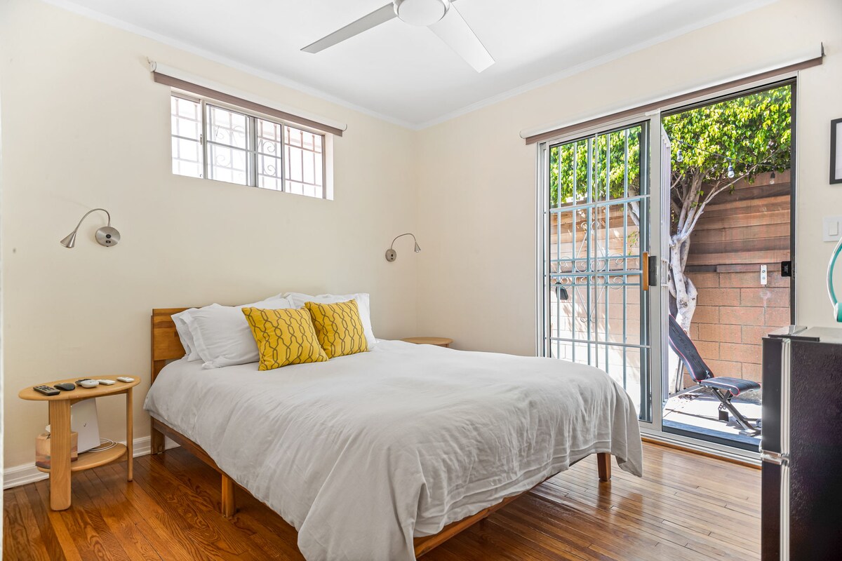 Et donem la benvinguda al teu tranquil refugi privat al cor de East Hollywood. Aquest acollidor dormitori disposa d'un bany renovat, un armari complet i una entrada privada que condueix a un encantador pati exterior adornat amb llums de cafeteria. Gaudeix de wifi d'alta velocitat, un televisor de pantalla plana Sony OLED de 55 polzades, una mininevera i un microones a l'habitació i persianes opaques elèctriques per gaudir d'una estada tranquil·la. Es proporcionen llençols i tovalloles nets i nets per a la teva comoditat. Accés a l'equip de gimnàs de pes. Tingues en compte que no es permeten hostes addicionals.