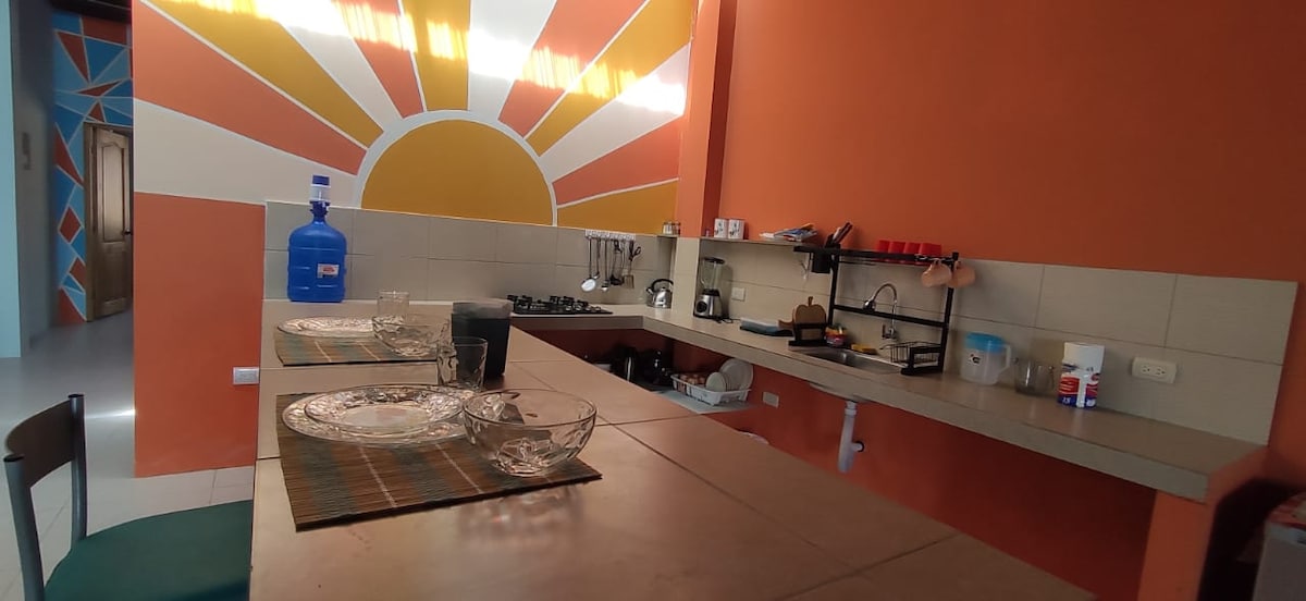 Aquí vens a viure la casa: a parlar fort, a cuinar amb gust i a compartir sense presses. A 7 minuts a peu de la platja, amb un ampli espai per jugar, descansar o reunir-se en grup. Durant l'estada, pots rebre hostes i les mascotes són benvingudes sense cap cost addicional. A pocs minuts amb cotxe pots accedir a altres complexos hotelers propers: Olón, Montañita, Los Frailes o Ayampe.