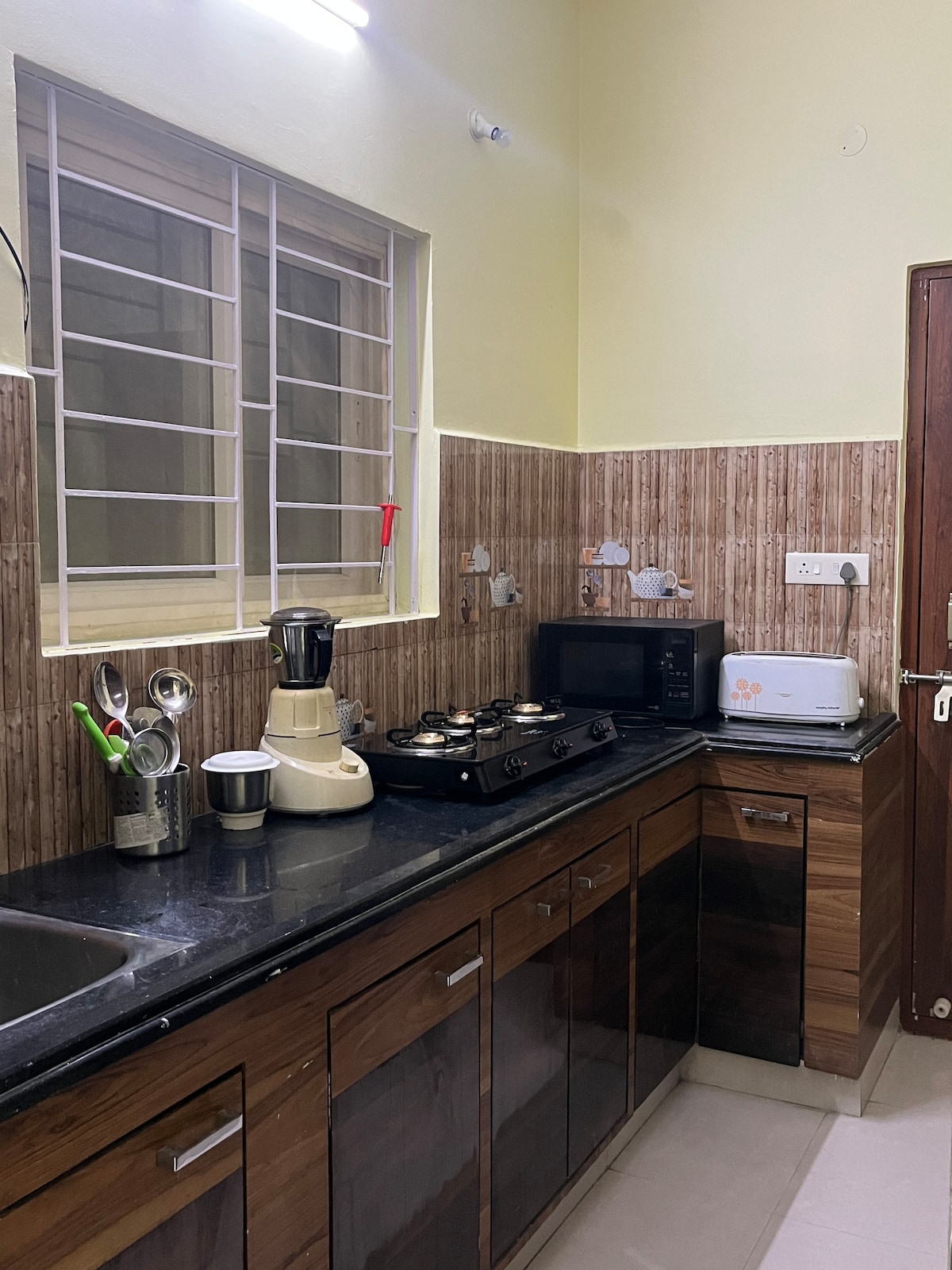 Ampli apartament de luxe de 3 habitacions a les prestigioses Evara Suites de Kondapur, a pocs passos dels centres informàtics de HITEC City i Gachibowli. Aquest modern allotjament de 167 metres quadrats té capacitat per a 7 persones i disposa d'equipament i serveis de primera qualitat, wifi d'alta velocitat, balcó privat, cuina completa i aparcament gratuït. És perfecte per a estades llargues, allotjaments per a viatges de negocis o escapades en família al corredor tecnològic d'Hyderabad. És bo saber-ho abans de fer la reserva: ✔ Adequat per a famílies i grups que viatgen per vacances, per feina o per motius mèdics 🚫 No es permeten festes ni begudes alcohòliques