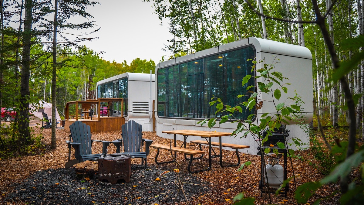 Càpsula 🌲 de glàmping de luxe | La natura i la comoditat | Navigate Pinawa 🌲 Escapa't de la rutina i submergeix-te en la natura sense sacrificar la comoditat en les nostres càpsules de glamping ecològiques de luxe, situades just davant de l'impressionant antiga presa de Pinawa. 🛌 Cada càpsula inclou: ✔️ Un interior acollidor i totalment moblat amb un llit «queen size» ✔️ Accés a sauna de llenya i banyera d'hidromassatge (compartits) Foguera ✔️ privada - Els hostes poden reservar franges horàries privades de dues hores per a la sauna i la banyera d'hidromassatge per garantir una experiència totalment privada.