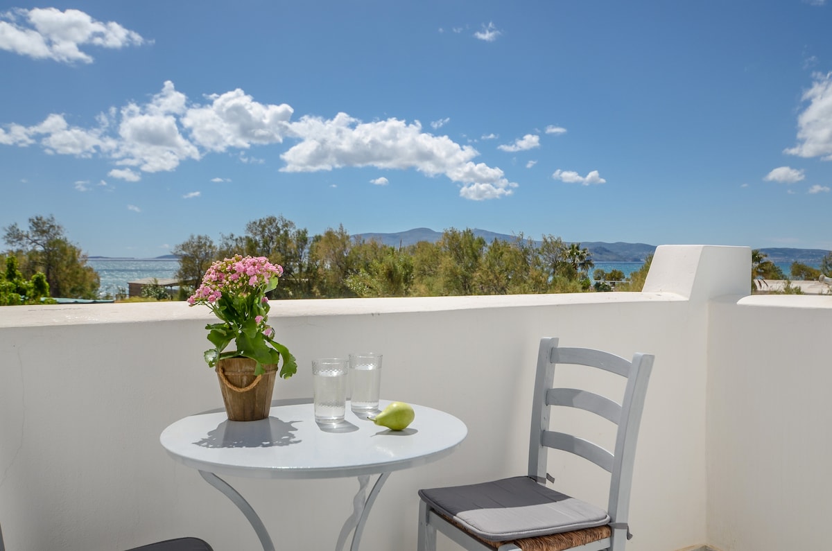 Descobreix una suite renovada a la vora de la platja, a només 5 metres de l'aigua, amb un balcó privat amb un jacuzzi relaxant i unes vistes impressionants de la posta de sol sobre el mar Egeu. Entra per l'Island Bar, el famós lloc de Naxos, per gaudir d'una arribada única. T'encantaran els detalls d'estil cicládic, les comoditats senzilles i les vistes al mar. És perfecte per a parelles, famílies o amics que busquen una escapada a l'illa inoblidable.