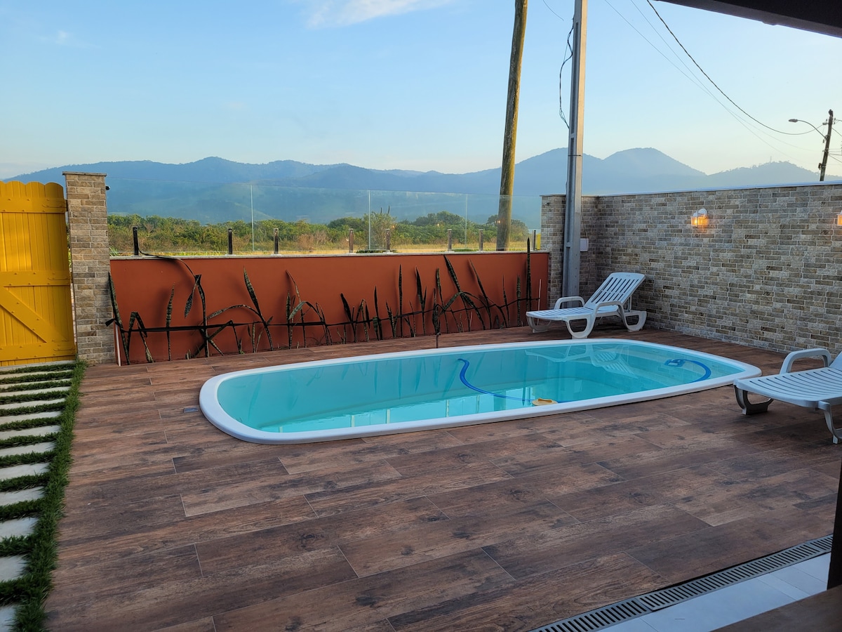 Casa amb piscina, barbacoa, billar, dink, ping pong, Wi-Fi i vistes a la llacuna Jacaroá, a 5 minuts del centre de Maricá (accés pavimentat). Situada en un altiplà,la casa té 2 plantes. La planta superior (principal) té 4 dormitoris, amb 1 en suite i 1 dependència, 2 banys, gran saló menjador amb balcó i cuina equipada. La planta inferior disposa d'un dormitori, cuina, bany i una gran sala de jocs amb balcó.