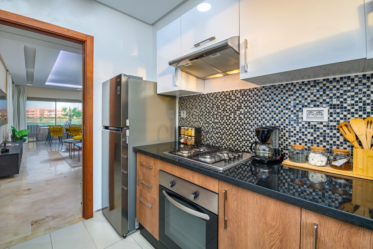 Pis lluminós i luxós, i un lloc meravellós per passar les vacances, amb un jardí privat al complex de golf més singular i central de Prestígia de Marrakech. Es troba a només 5 minuts en cotxe de l'aeroport de Marrakech Menara i a 5 minuts en cotxe del centre de la ciutat de Gueliz i dels zocs de Médina. Als complexos turístics de Prestigia trobaràs pau, tranquil·litat i seguretat, així com una disponibilitat a totes les distraccions que necessitaràs, com per anar de compres i entreteniment (golf, clubs, restaurants, cinema, etc.)