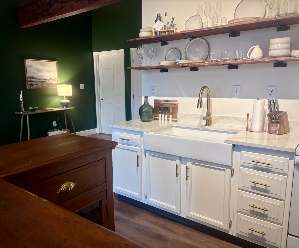 T'encantarà el nostre allotjament. Llegeix les nostres avaluacions i comprova-ho! Gaudeix d'una experiència elegant en aquest allotjament cèntric. Oferim una casa d'un dormitori i un bany. El dormitori té un llit «queen size» i el sofà té un llit extraïble «queen size» d'escuma viscoelàstica. Hem afegit un escriptori al menjador i una bonica cafeteria a la cuina. Pots gaudir del porxo principal tancat mentre et relaxes a les mecedores. Tenim una rentadora i una assecadora de mida completa situades fora de la cuina .