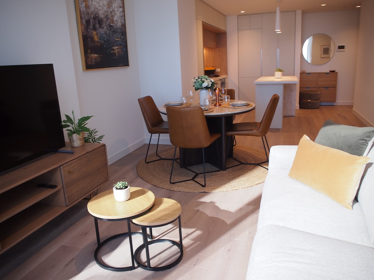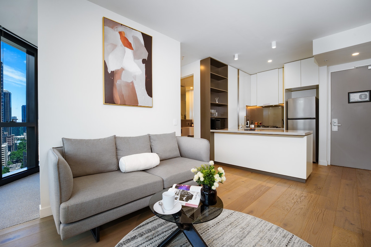 Un espai tranquil per sentir-te com a casa mentre ets a Melbourne, el teu propi apartament de 2 habitacions i 2 banys (interior de 64 metres quadrats + balcó de 6 metres quadrats). Dissenyat tenint en compte un santuari, modern i minimalista. Gaudeix de les increïbles vistes de l'horitzó de la ciutat. És un espai apte per a famílies. Situat al costat de l'estació Southern Cross i la terminal d'autobusos Sky. Situat a la zona de tramvia lliure, tot el que Melbourne té per oferir està al teu abast, a prop de restaurants barats, restaurants elegants i cafeteries de moda.
