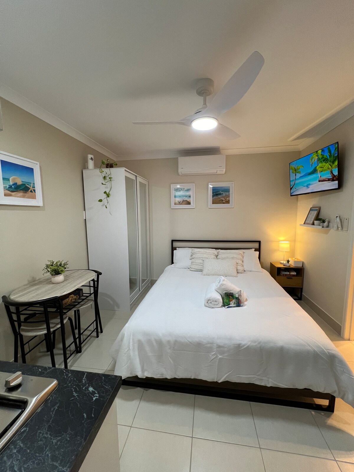 Palm View és una unitat d'1 dormitori. amb entrada privada. Tens el teu propi bany, planta oberta, cuina i menjador. Inclou aire condicionat per conductes i ventiladors de sostre. La porta corredissa dona al pati privat amb mobles d'exterior. La piscina mineral de magnesi se sent sedosa i llisa a la pell i pot ajudar-te a alleujar els dolors i els dolors, una manera fantàstica de relaxar-te i descansar. La piscina és un espai compartit. També hi ha una altra zona exterior al costat de la piscina per relaxar-se o fer una barbacoa.