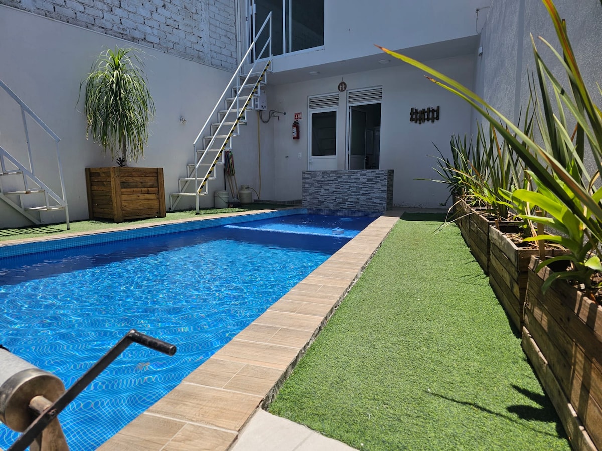 Relaxa't en aquest espai tranquil i elegant, ideal per passar uns dies relaxant-te. Amb piscina privada climatitzada (de 30 a 32 graus), jardí relaxant, terrassa oberta, cuina petita i barbacoa estan totalment equipades. Té 2 dormitoris amb un disseny excel·lent i preparats per gaudir d'un descans agradable, amb llit King a la principal i Queen al segon dormitori ✔ Minisplit en ambdós dormitoris. ✔ Mini nevera del dormitori principal ✔ Internet a tota la casa de 500 Megas
