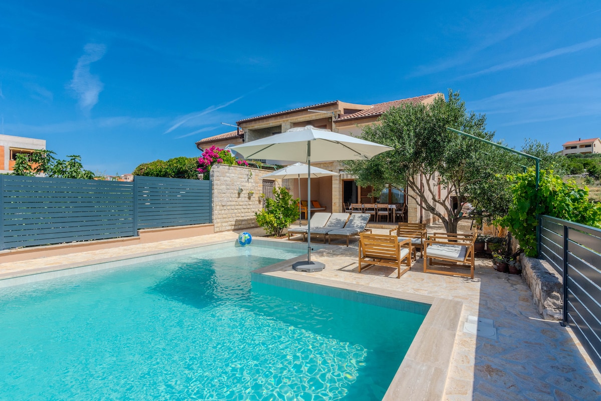 Aquesta bonica vil·la amb piscina climatitzada, banyera d'hidromassatge i sauna està situada en un paisatge remot i aïllat amb una vista impressionant de la vall. Piscina climatitzada d'abril a novembre Un lloc fantàstic per relaxar-se i un punt de partida per explorar la regió i Croàcia! Distància de la ciutat Zadar és a 28 km (aeroport a 20 km) Šibenik és a 50 km Split és a 125 km (l'aeroport, a 99 km) Distància a les atraccions Els llacs de Plitvice, a 125 km Krka a 45 km Kornati a 30 km