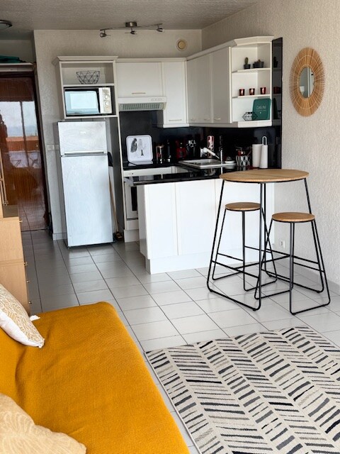 Entre el port i la platja, estudi moblat totalment reformat per a 2 persones, a la 7a i última planta d'una residència amb 2 ascensors S'han instal·lat cortines opaques per a la nit amb sofà llit (no hi ha persianes) Cuina moblada i equipada: placa d'inducció 2 fogons, nevera, cafetera Senseo, microones. Bany amb vàter, dutxa, rentadora 🅿Plaça d'aparcament privada inclosa, que és essencial per a la teva tranquil·litat a la temporada d'estiu Emmagatzematge de bicicletes comú disponible
