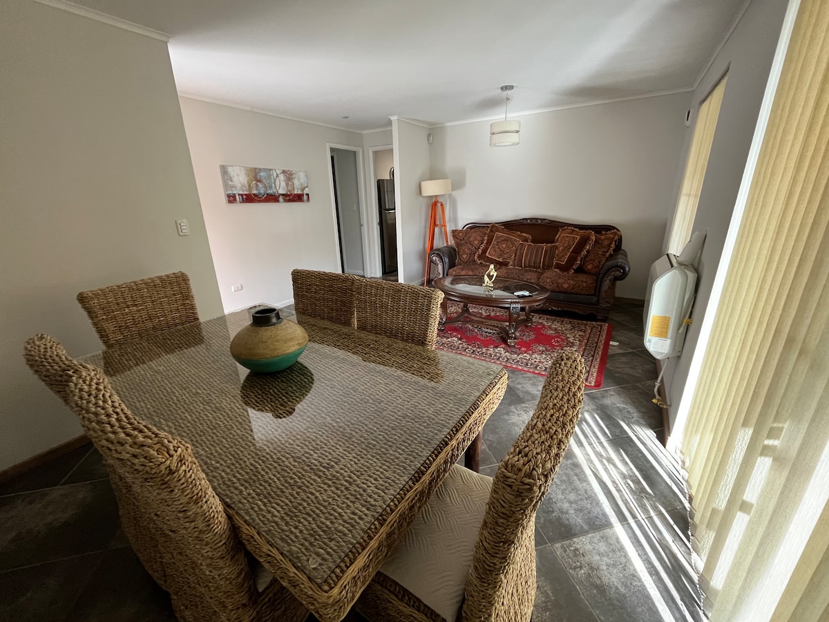 Pis elegant i sofisticat, situat al sector nord de la ciutat de Talca, a poca distància a peu de la Universitat de Talca i a 1 minut en vehicle de l'entrada nord de la ciutat per la ruta 5. Un entorn tranquil i segur. Té tot el que necessites per descansar bé per a tu i els teus acompanyants. Apartament a la primera planta amb tres dormitoris i dos banys, cuina independent i terrassa per compartir a l'aire lliure. Inclou wifi i televisor LED amb DirectvGo. Amb un pany digital per accedir-hi.