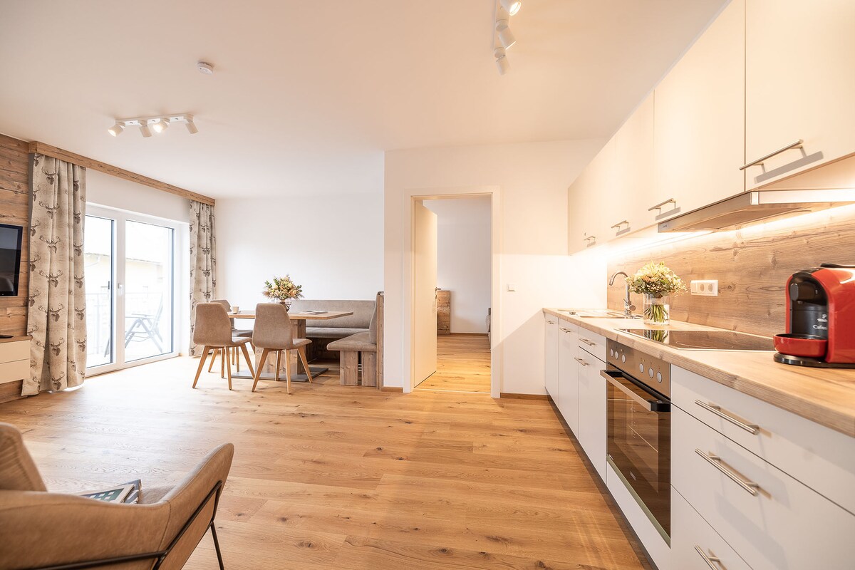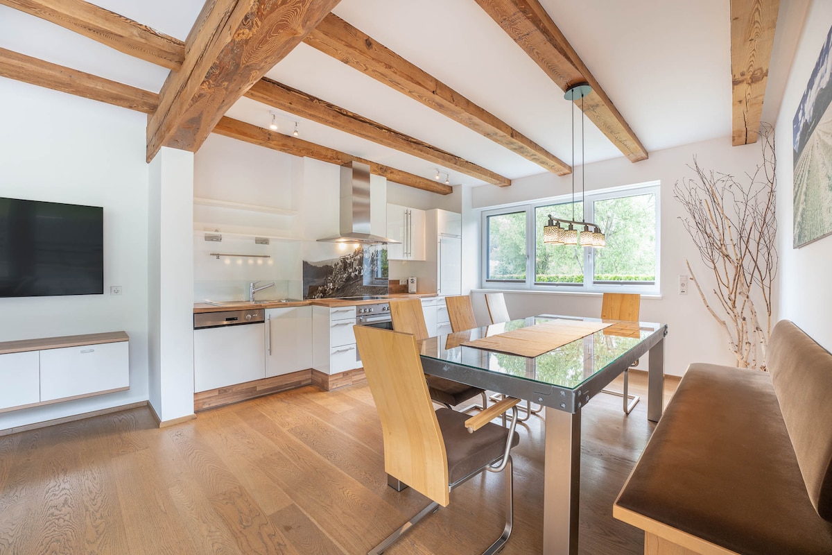 Et donem la benvinguda a l'àtic GIPFEL-GLÜCK. El pinacle de la Residència Sunleitn: 107 m² (1.153 peus quadrats) amb una zona d'estar/menjador oberta i un impressionant hivernacle amb sostre de vidre. Cuina totalment equipada i accés a la terrassa espaiosa amb una vista panoràmica de 180° de la muntanya amb total privacitat. Relaxa't a la sauna finlandesa privada de fusta recuperada amb vistes a les muntanyes. 2 dormitoris, ideals per a un màxim de 4 hostes.