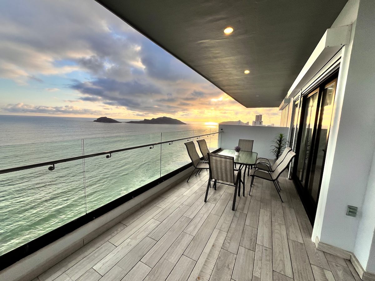 Modern condomini a primera línia de platja amb una de les vistes més espectaculars de tot Mazatlán. Complet amb una sala d'estar oberta, cuina, dos llits extraïbles, dos banys complets, WIFI i televisió per cable. El condomini inclou un balcó en el qual pots gaudir i relaxar-te amb una magnífica posta de sol. Un altre avantatge seria la piscina infinita, el jacuzzi, el gimnàs i el spa, tot gratuït. A part de les increïbles vistes, també hi ha molts restaurants, la platja, llocs històrics i moltes altres activitats a pocs minuts.