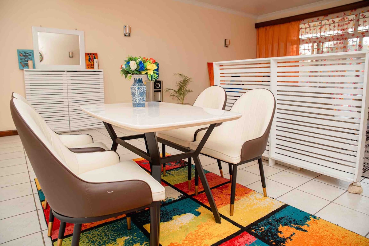 Enjoy your Dar stay in our serene one-bedroom apartment. Get restful sleep on the comfortable queen bed, prepare hearty meals in the fully equipped kitchen, get work done with Wi-Fi, play a round of scrabble in the multi-purpose dining area, or grab a book to read in the lush garden. The apartment is in a gated compound, 45 minutes from the airport. You’ll have access to air conditioning, hot water, and free parking. You’ll also be near ATMs, fruit stalls, mini-marts, and pharmacies.