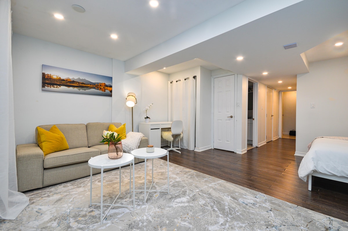 Gaudeix d'un refugi tranquil a la part inferior de la nostra encantadora casa, perfecta per relaxar-te o treballar a distància. Situat a prop de Canada's Wonderland, trobaràs exquisits restaurants italians i asiàtics a pocs minuts. Gaudeix d'un viatge ràpid a l'aeroport de Pearson i explora les atraccions properes, com el centre comercial Vaughan Mills i els parcs panoràmics, tots fàcilment accessibles amb tren al centre de Toronto. Amb la Universitat de York a només 8 km, estàs en una ubicació ideal per a l'oci i l'aprenentatge. Gaudeix de la comoditat i la comoditat!
