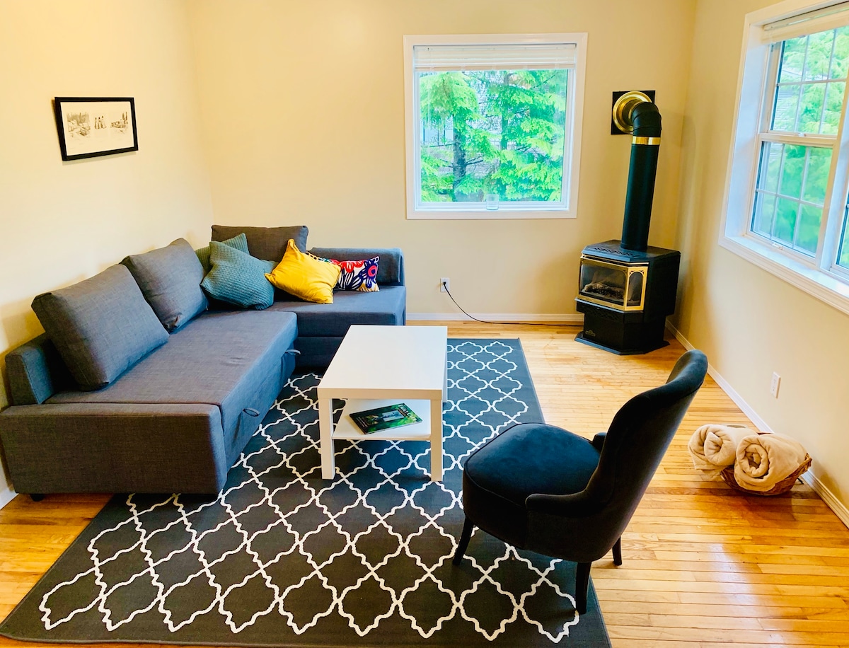 Et donem la benvinguda a la «Blue Cedar Suite». Un apartament lluminós i espaiós de 2 dormitoris amb una gran sala d'estar, cuina totalment equipada i la teva pròpia terrassa i pati. Situat a poca distància a peu de la costa oest. Destacats, com la platja MacKenzie, on pots fer fogueres, provar SUP i experimentar postes de sol impressionants. A 400 metres trobaràs tot el que necessites, és a dir, una petita botiga general i lloguer de surf, llocs de menjar comTacofino. Es troba a 2 minuts en cotxe de la platja de Chesterman i del centre de Tofino.