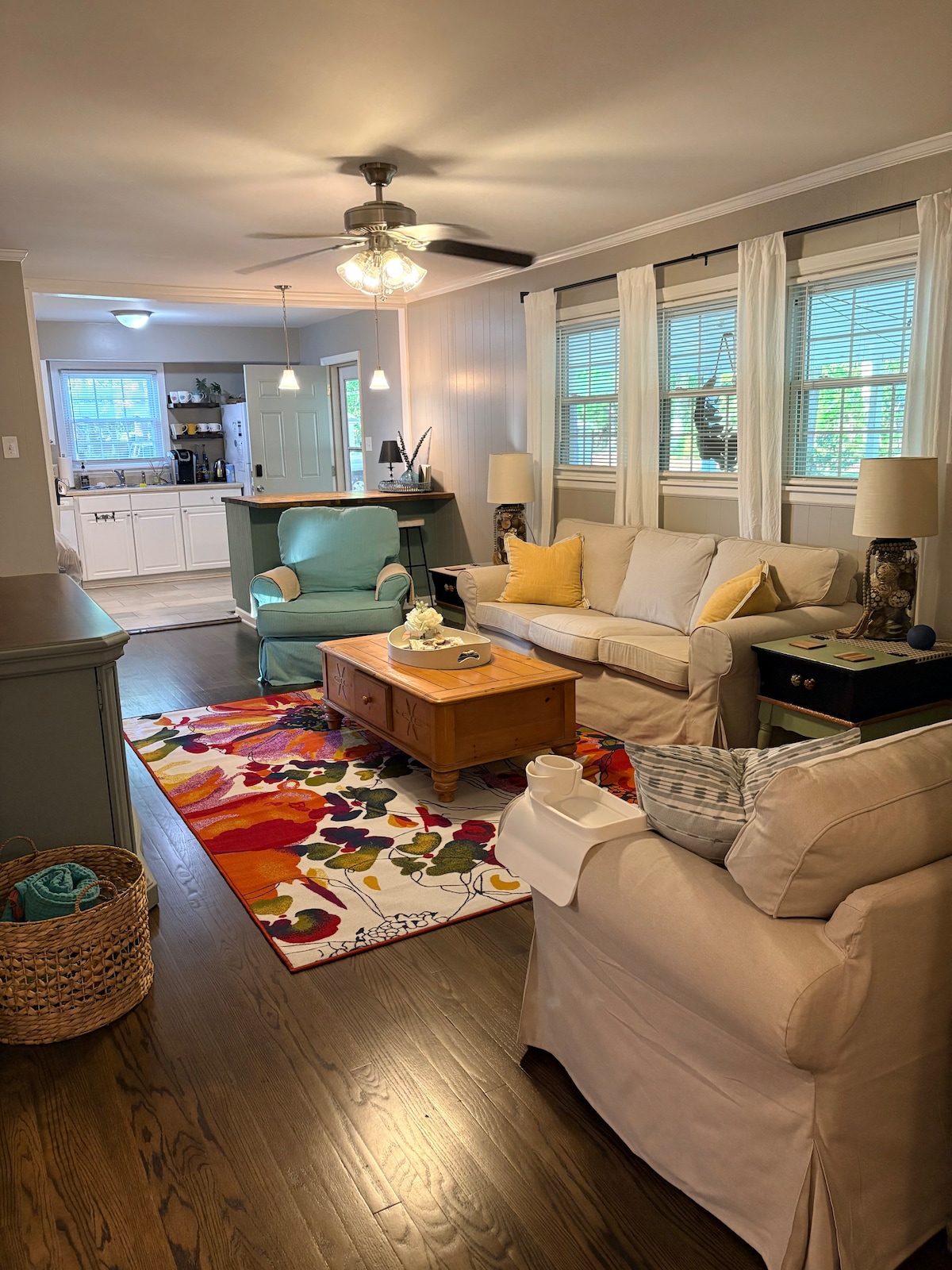 Encantadora casa 3BR/2BA a només 1/2 milla del centre de Mebane's botigues, restaurants i cerveseria. A menys de 30 minuts de Chapel Hill/Durham i a 27 milles de l'aeroport RDU, és perfecte per a viatges de feina o per visitar nens universitaris. A l'abril, gaudeix del vibrant Dogwood Festival amb música en directe, venedors, viatges i un 5K. Gaudeix d'un porxo cobert, una terrassa al darrere, una cuina totalment equipada, televisors a la sala d'estar i al dormitori principal, un llit còmode, llits superposats, un llit complet, a més d'una rentadora i una assecadora. (els gossos són benvinguts, ho sentim, no hi ha gats).