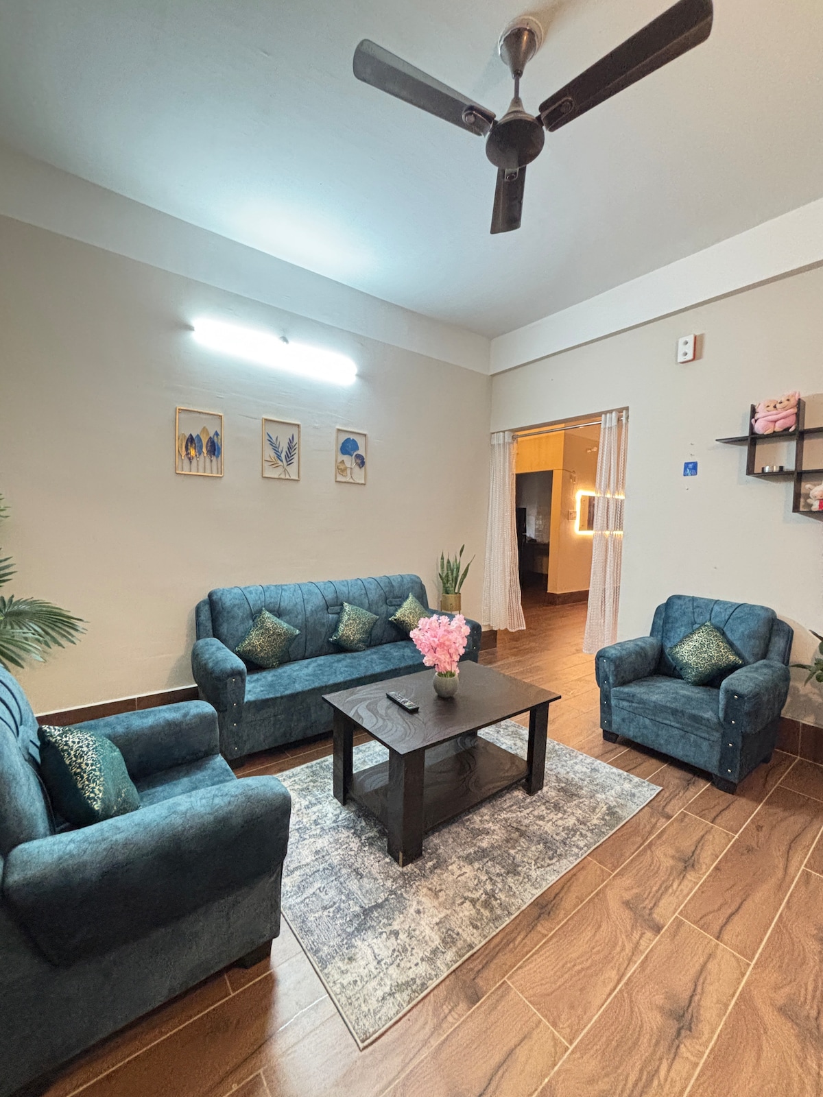 Relax in our Carebnb stylish boho-chic apartment with a plush king bed, cozy sofa cum queen bed for 2, full kitchen, and a cute bathroom. Enjoy AC, Wi-Fi, smart TV, balcony, and private parking. The master bedroom offers a king-sized bed for 2, layered with premium linens, warm lighting and a cozy recessed window cove. Cook like a pro in the fully stocked kitchen, complete with a real wood dining table set and eco-friendly, biodegradable tableware—a mindful touch for sustainable travelers.