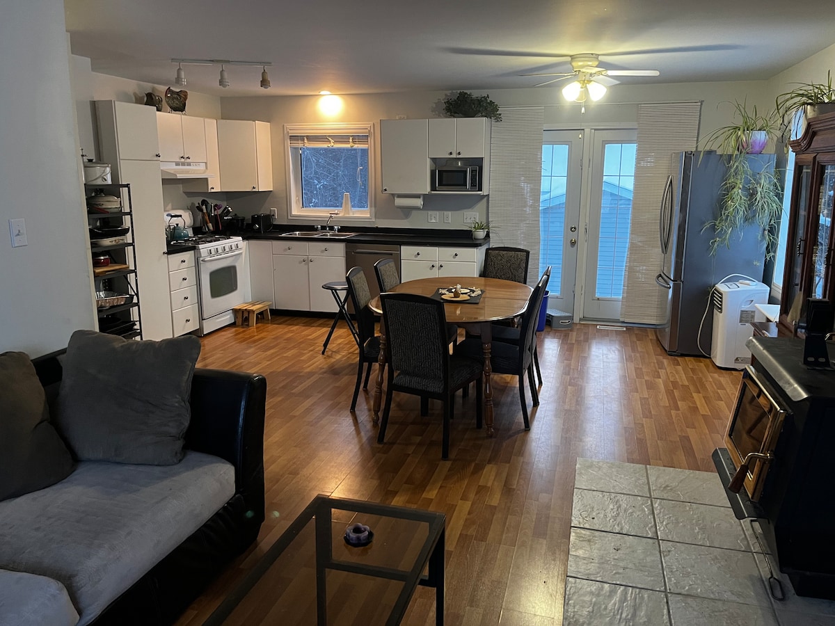 1500 square feet lower level of new home. 2 bedrooms with 4 queen beds, living room, dining room and light housekeeping food prep area. refrigerator, coffee maker, kettle, toaster, dishes and induction hot plate and electric frying pan. The entrance is almost private just a quick few steps to the lower level. We are currently assembling the pool table. there are 2 desk areas if you need to work from our home. The renters must meet all local COVID requirements