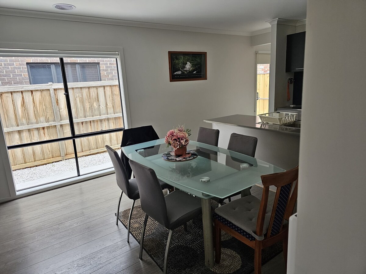 Casa familiar moderna i elegant de 4 dormitoris i 4 banys a la tranquil·la Strathtulloh. Gaudeix d'un espai obert, una cuina totalment equipada, dormitoris còmodes, banys privats i un pati privat. Situat a prop de l'estació de Cobblebank, el centre comercial Woodgrove, l'autopista, les escoles, la universitat i el nou hospital de Melton. Perfecte per a famílies o grups que busquen comoditat, estil i accés fàcil a tots els serveis.