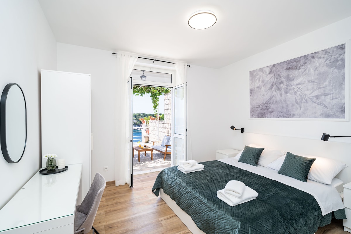 L'apartament Royal de 50 metres quadrats està situat en una preciosa vil·la a la península de Lapad, a només 5 minuts a peu de les platges més properes i a 4 km del casc antic de Dubrovnik, el principal port de ferri i la terminal d'autobusos. La parada d'autobús més propera està a 50 metres. És completament nou, amb cuina totalment equipada, televisor de pantalla plana amb Netflix, aire condicionat, wifi, llit romàntic amb marquesina i banyera d'hidromassatge. Gaudeix de les espectaculars vistes, banya't a la piscina infinita i pren el sol a la terrassa amb vistes al mar.
