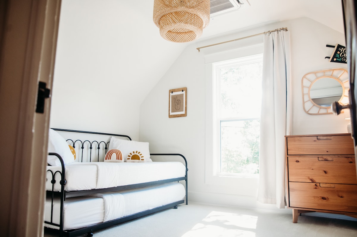 Gaudeix del bell canal i de les encantadores vistes del barri des del porxo cobert. El nostre moll s'estén fins al canal que ofereix un camí pintoresc i serpentejant fins a les aigües obertes del Gran Llac. La ubicació és ideal per pescar i atracar en vaixell durant el dia. Des del porxo, el pati del darrere està completament tancat per protegir els més petits. (Et demanem que deixis els teus animals de companyia en bon estat. No estan permesos.) Relaxa't al gran porxo i còmode i gaudeix de la casa rural actualitzada i acollidora.