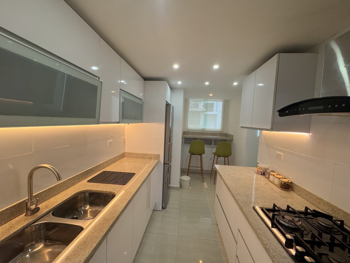 Pis situat al centre de la ciutat, a prop de supermercats, telefèric, mercat principal i Plaça Bolívar. Amb tots els serveis bàsics, làmpades d'emergència, 2 aire condicionat, wifi, Ups i aparcament. L'apartament té 1 llit doble gran, 2 llits individuals i un sofà llit, 2 banys, 1 balcó estudi, menjador, televisor de 50", cuina equipada: nevera, batedora, cafetera, microones, estris, calefacció, rentadora i assecadora. Ofereix tovalloles i roba de llit