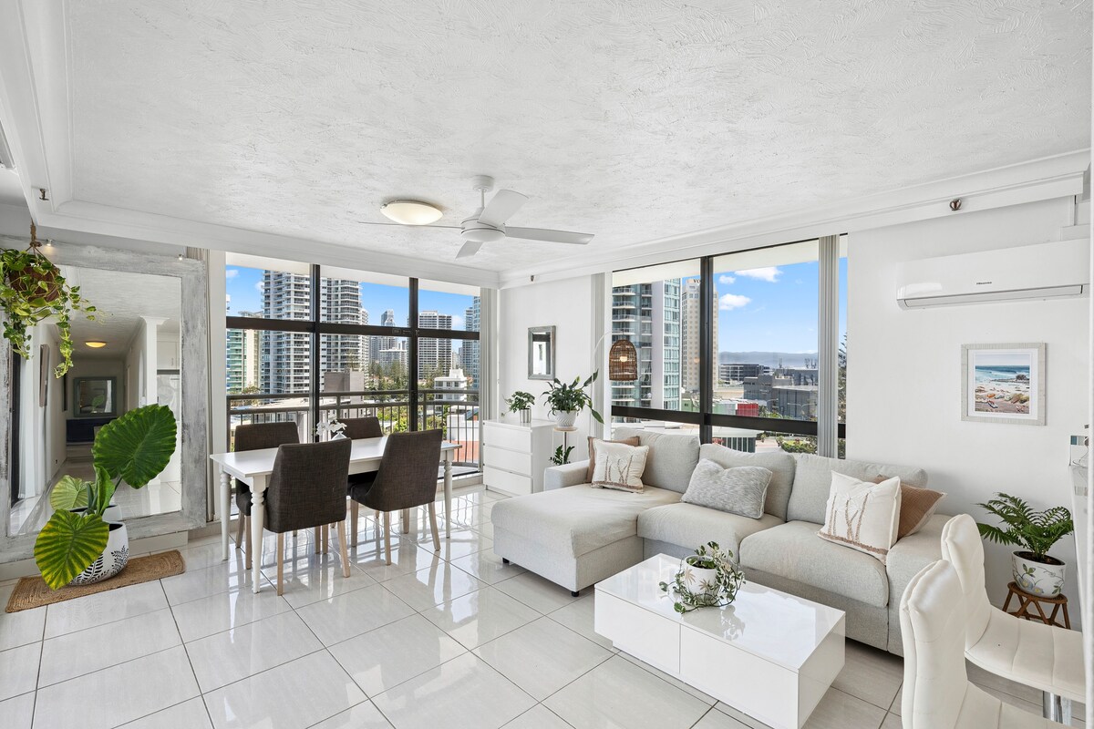 Pis de luxe a la platja amb vistes ININTERRUPTES de milions de dòlars de l'oceà a la ciutat des d'un nivell alt en una ubicació molt sol·licitada a Surfers Paradise. BALCÓ ☆EXTREMADAMENT GRAN amb menjador i sala d'estar que et fan sentir com si estiguessis flotant! ☆LA MILLOR UBICACIÓ, a 3 minuts a peu de la platja central de Surfers Paradise (220 metres) i Cavill Avenue, supermercat i restaurants a la planta baixa. ☆LES MILLORS VISTES, un paisatge preciós de dia i unes llums nocturnes inoblidables.