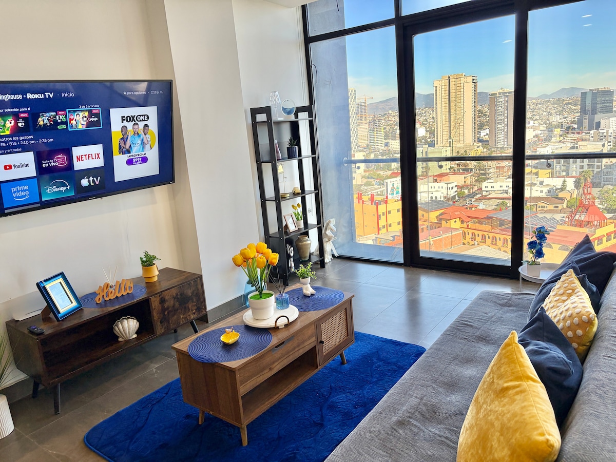 Gaudeix de la comoditat d'aquest allotjament nou, tranquil i molt cèntric. Vistes fantàstiques i una ubicació magnífica a només 5 minuts de la frontera entre Mèxic i els Estats Units. A només uns carrers de l'animada Av. Revolution. A només uns passos de restaurants, oci nocturn i consultoris mèdics. Té 1 dormitori (1 llit queen + matalàs inflable), 1 televisor de 50" amb aplicacions: HBO, Netflix, MLB. Utensilis de cuina, rentadora, assecadora i planxa per a la roba, assecador de cabells. Aparcament gratuït amb seguretat les 24 hores