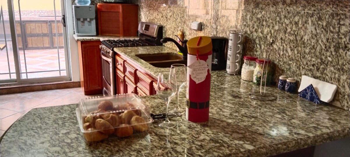 Té 2 dormitoris a la segona planta, té 3 llits, 2 de matrimoni i 1 de doble. A la primera planta hi ha la cuina, un bany complet i una sala d'estar amb televisor de 65", bany i sofà llit. A l'exterior hi ha una piscina, un tobogan d'aigua, un bany i un ampli pati per a diversos cotxes. Poden tenir un nombre màxim d'hostes i marxen a les 23:00. Si es queden a dormir, hi ha un cost addicional. L'oxxo està a menys de 150 metres a peu de la casa.