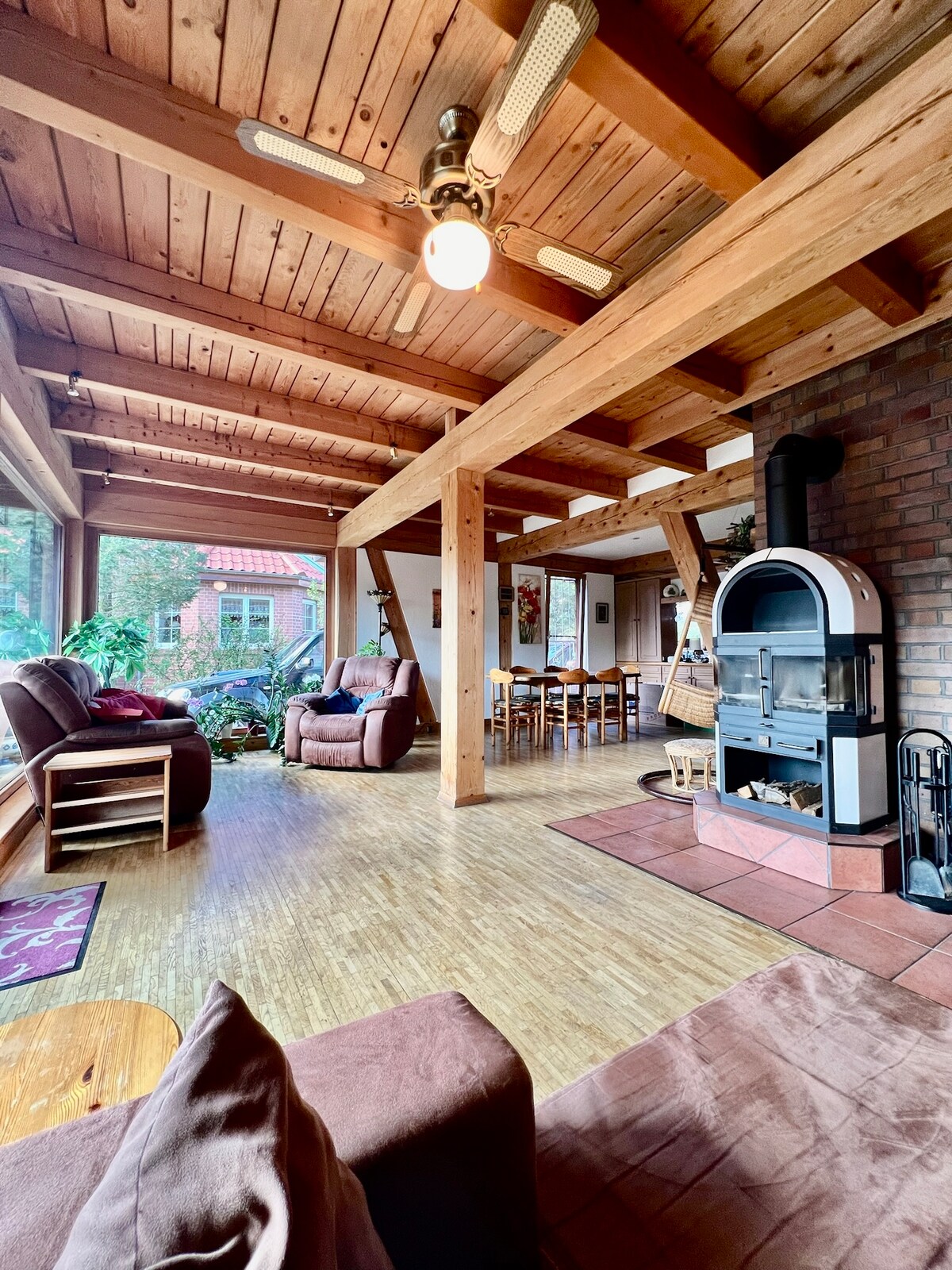 El lloguer de vacances es troba just al centre del nostre pati de quatre cares. Si surts per la porta principal, estaràs just al pati verd. A la gran taula de fusta, als nostres llogaters i hostes els agrada trobar-se per fer una barbacoa, xerrar, jugar a tennis de taula o prendre una cervesa després de la feina. A l'hivern, l'esdeveniment es torna al conservatori i a la llar de foc.