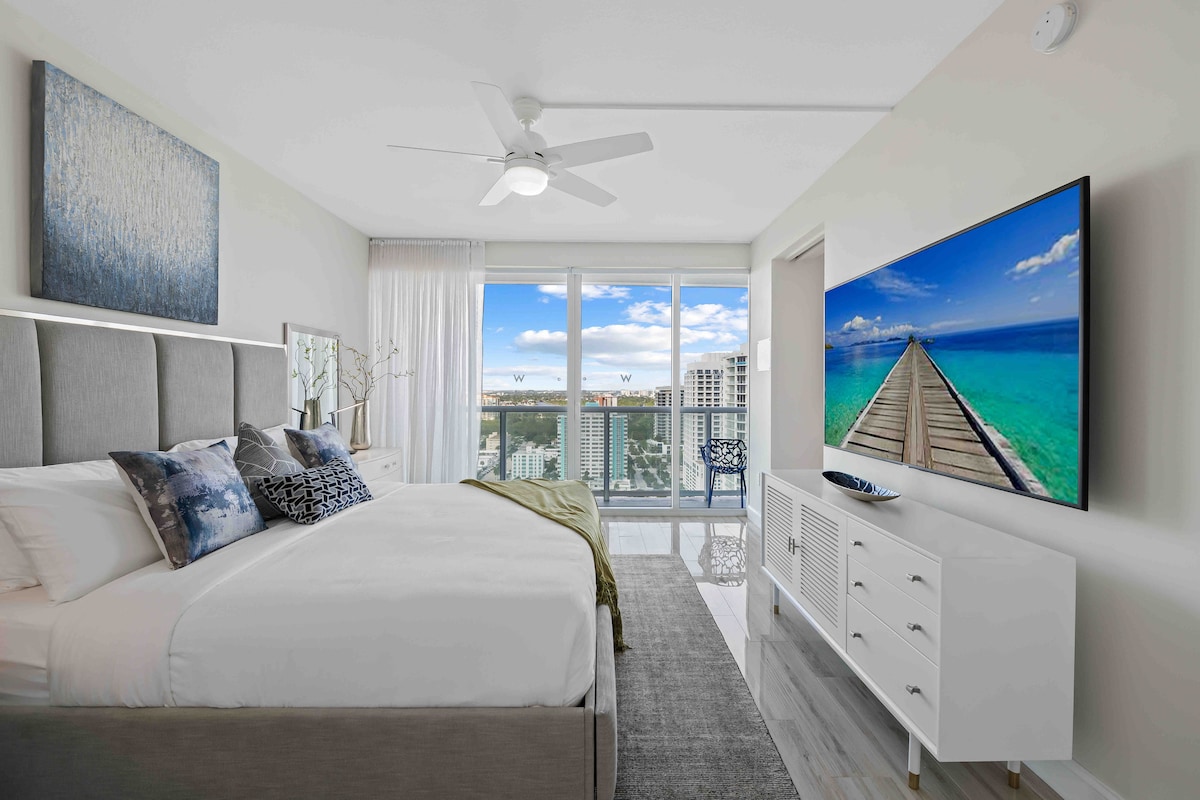 Pis de luxe al 12è pis a la Residència W. Totalment moblada, 2 dormitoris/2 banys amb vistes panoràmiques de 180° de la ciutat i de l'Intracoastal, a més d'una bonica vista lateral de l'oceà des del balcó i la sala d'estar. Cuina moderna amb electrodomèstics de primera qualitat, rentadora i assecadora a l'allotjament. Serveis d'estil resort: servei a la platja, piscines, jacuzzi, spa, gimnàs i bar a la sala d'estar. Sopa a Steak 954, El Vez i Sobe Vegan, a només un ascensor de distància. A prop de W Water Taxi, botigues, vida nocturna i la platja.
