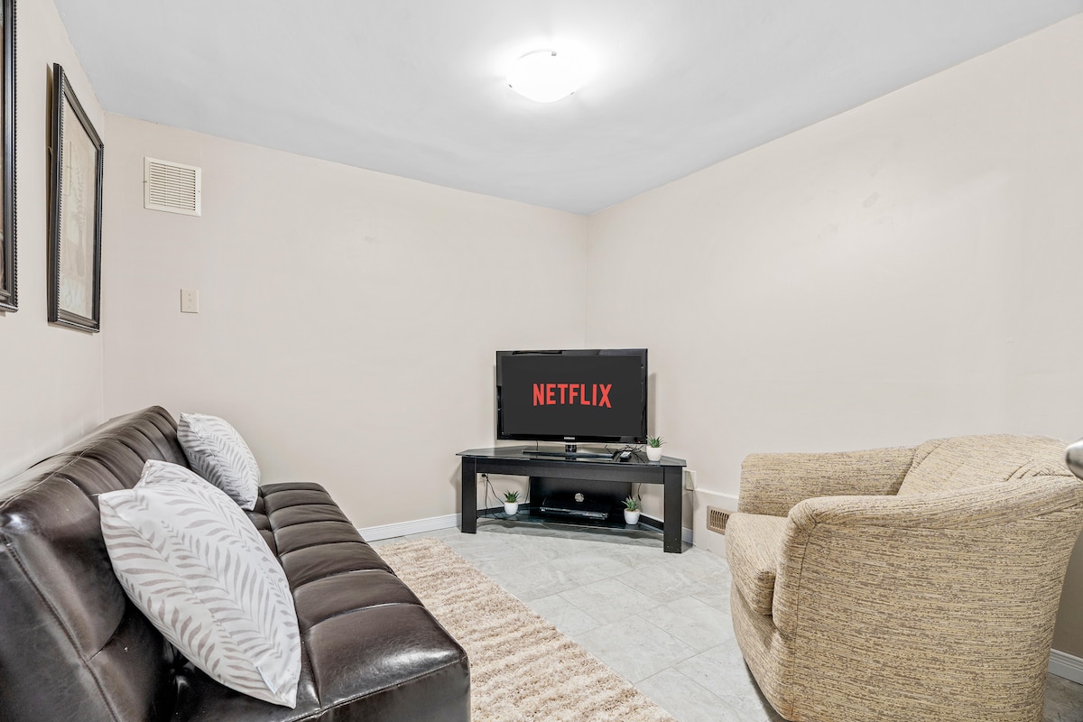 Benvingut, vine i relaxa't en aquesta suite per a convidats al soterrani, neta i espaiosa. Tingues en compte que aquesta és una casa d'hostes per a NO FUMADORS. No és el soterrani típic amb tres grans finestres que reben tanta llum natural o que pots tancar les persianes i fer-lo acollidor. No et preocupis, t'he proporcionat tot el que necessites per a la teva estada. * Entrada independent * 1 plaça d'aparcament (carrer compartit) * Espai de treball exclusiu * Bugaderia a l'allotjament per a estades llargues de 7 dies * Sofà reclinable * Televisor intel·ligent de 65 polzades amb Netflix i Amazon