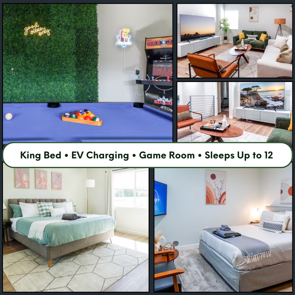 ✨ Porta tota la família! Aquest allotjament espaiós de 4 dormitoris amb 6 llits còmodes és perfecte per a famílies i amics. El disseny obert i modern està ple de llum natural gràcies a les claraboies, i cada detall s'ha dissenyat perquè sigui acollidor i agradable. 🌞🏡 Relaxa't a la sala d'estar amb un televisor enorme de 70 polzades, cuina amb els teus a la cuina totalment equipada o comparteix un àpat a l'aire lliure a la taula del pati per a 8 persones. A més, gaudeix d'un divertit mural fotogràfic que captura les autèntiques vibracions de Califòrnia! 🌴📸