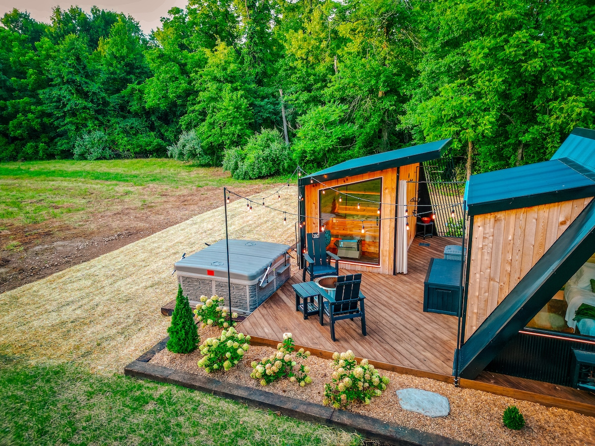 El glamping Oasis amb sauna i banyera d'hidromassatge