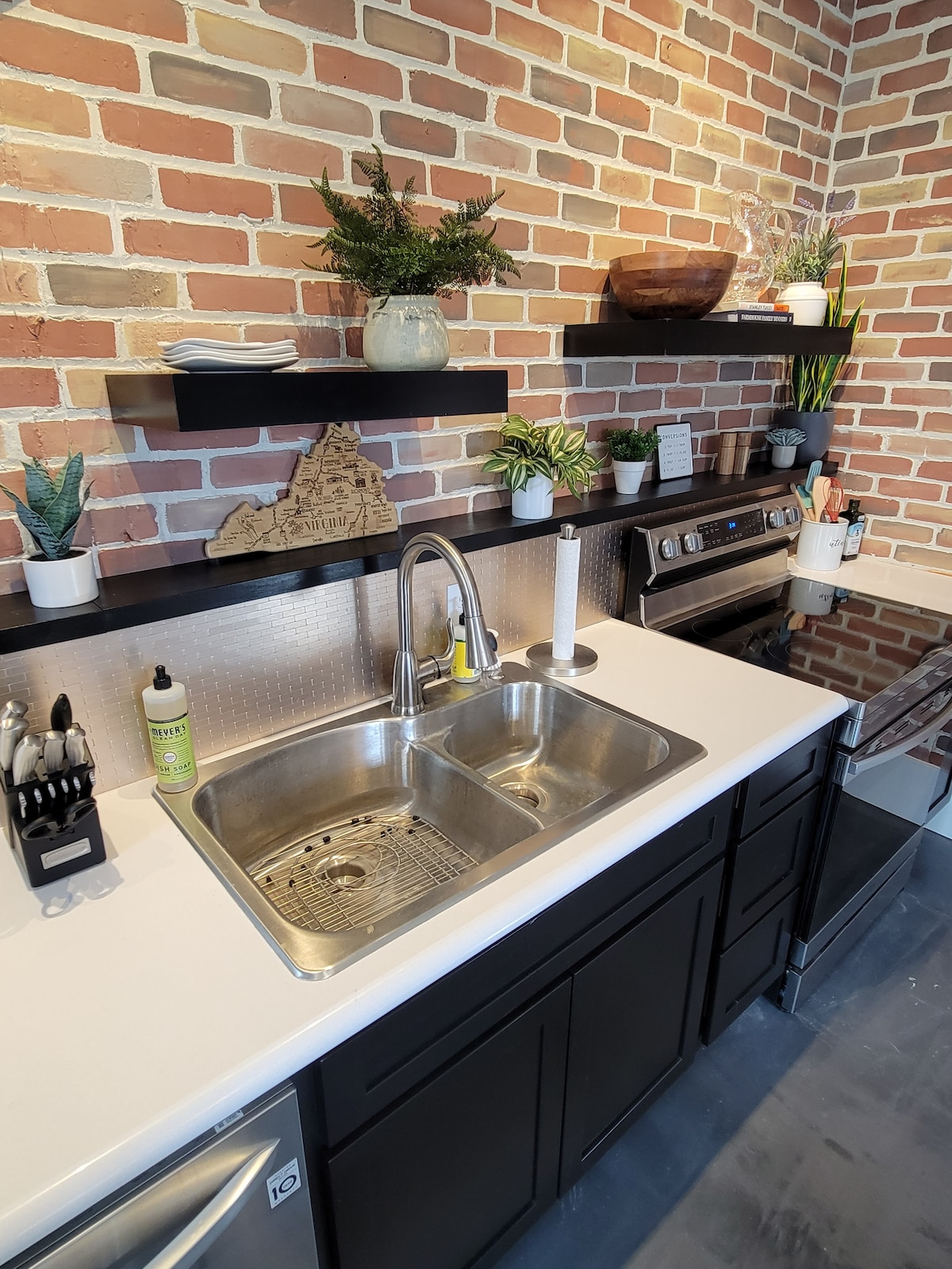 A 2 bedroom 2 bath high-end loft with luxury finishes. The space features a balcony and table in the back and is decorated with a Foodie theme. The space features a full kitchen with a dishwasher, large island, and a nice assortment of quality cook and prep ware. The larger bedroom has a king bed, the smaller one a queen. The central downtown location means you can walk to everything Roanoke has to offer, including the "Exchange". Paid daily parking (by the day) available in adjacent lot.