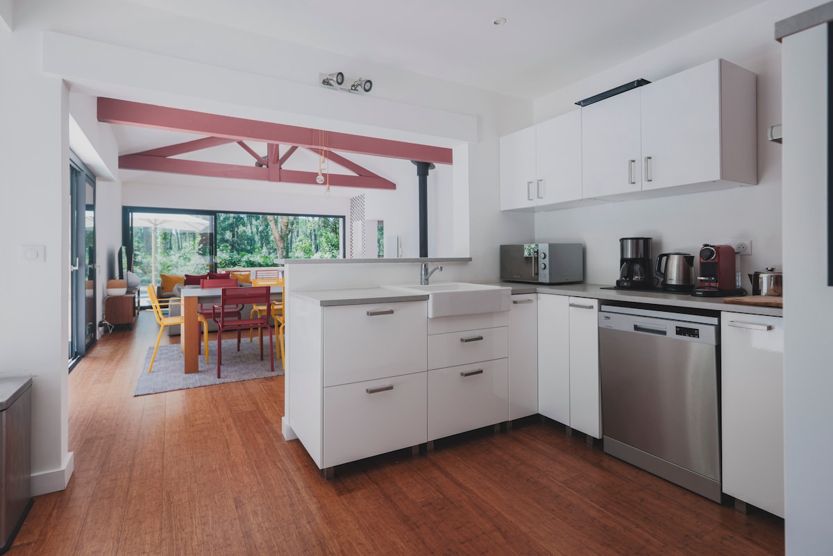 Casa nova envoltada de bosc al costat del carril bici i les platges de la costa de les Landes Consta d'una sala d'estar amb cuina americana, 3 dormitoris, incloent-hi 1 suite principal amb bany i vàter , per acabar un altre bany i un vàter independent. Fibra d'internet 🛜 Per a l'exterior, una piscina sud completa de 4 per 8,5 m climatitzada d'abril a l'11 de novembre amb jardí enjardinat i 110 m2 de terrassa de fusta. Platja i golf de Moliets i maa a 10 minuts Vieux Boucau 15mn Hossegor 28mn . Biarritz 50mn