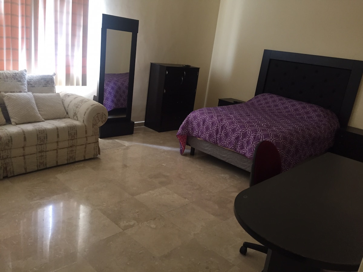 Gaudeix de l'experiència d'allotjar-te al cor de Monterrey. Pis lluminós i còmode de mida d'estudi amb llit queen, sofà llit, wifi, televisor d'alta definició, bany i cuina totalment equipada amb nevera i tot el que necessites. A prop del metro, el tren i els carrers importants, estaràs connectat amb tota la ciutat en qüestió de minuts.