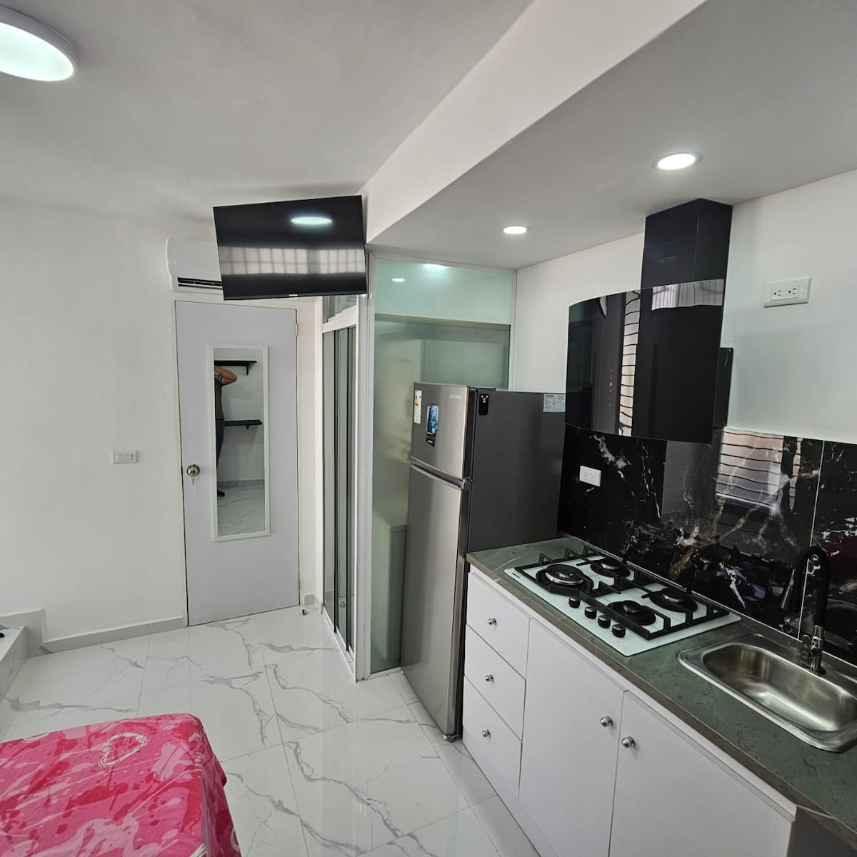 Este acogedor ANEXO tipo estudio ofrece todo lo necesario y es compacto y moderno. Ubicado en una zona céntrica, cuenta con una cama matrimonial, una cocina totalmente equipada con estufa, refrigerador y microondas. Este diseño claro crea un ambiente elegante y luminoso. Hay estanterías y espacio de almacenamiento, lo que permite mantener todo ordenado. Es perfecto para una o dos personas que busca comodidad, funcionalidad y cercanía a los principales puntos de interés de la ciudad.