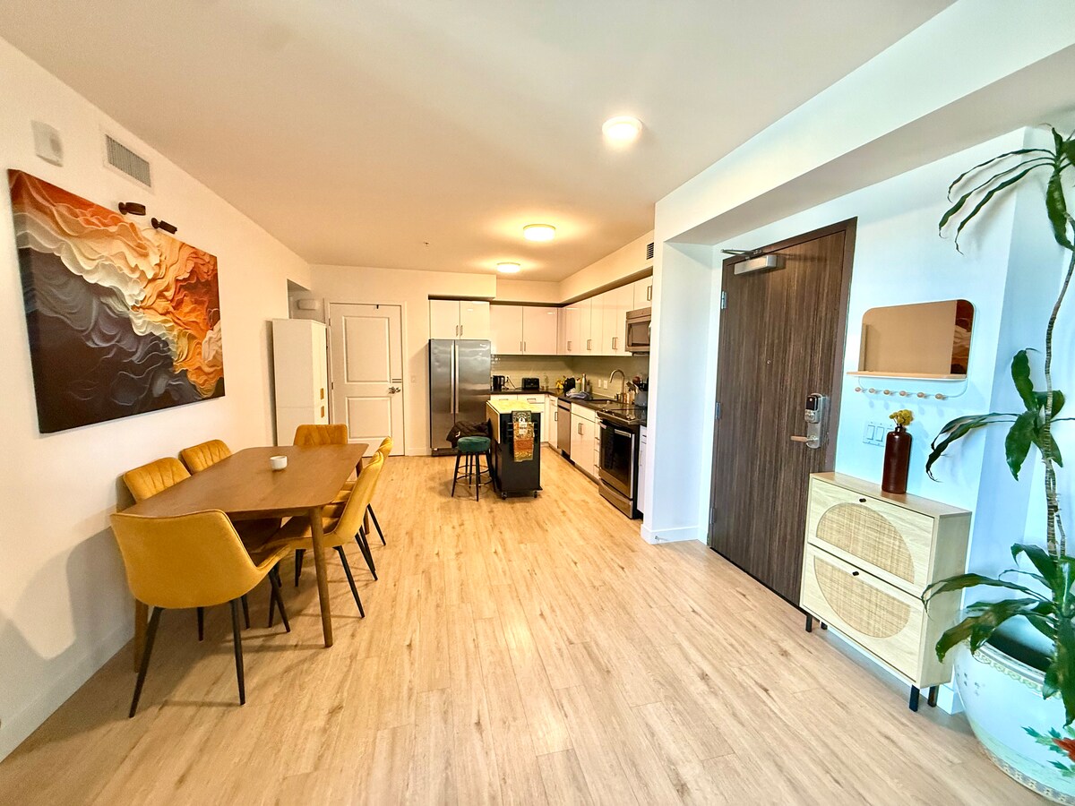 Gaudeix de la torre Salesforce il·luminada de nit des de les finestres que van del terra al sostre d'aquesta propietat immaculadament equipada, que inclou un gran armari vestidor i una dutxa de pluja. Els amants de la música agrairan la guitarra acústica i el teclat elèctric. Tingues en compte que aquesta residència té pertinences a l'armari. S'ha reservat una habitació àmplia per als hostes. Pis modern de luxe amb vistes increïbles, especialment de nit amb vistes a algunes de les ubicacions emblemàtiques de San Francisco, com AT&T Park, Salesforce Tower i San Francisco Bay. A l'interior de l'apartament, tens una cuina completa amb electrodomèstics d'acer inoxidable, un llit «queen size» amb un edredó de plomes, una gran dutxa a peu amb ruixador de pluja i una sala d'estar amb televisor de pantalla gran per accedir a Netflix/Hulu o Chromecast. Tot l'apartament està obert per als hostes, però tingues en compte que hi haurà roba penjada a l'armari i alguns objectes personals, ja que aquest és el meu allotjament i no un Airbnb a temps complet. La major part del temps encara estaré a la ciutat i estaré disponible si necessites res o tens alguna pregunta sobre la zona/pis. A tan sols una illa per arribar al famós Market Street, mentre que en 5 minuts es troba Hayes Valley, ple de botigues, cafeteries i bars de moda. Un passeig més llarg o un recorregut DE 5 minuts en Muni arribarà a l'emblemàtic edifici de ferris per fer excursions a Sausalito. A 5 minuts a peu de l'Auditori Cívic Bill Graham A 20 minuts a peu, a 5 minuts en cotxe o a 12 minuts de MUNI del Moscone Center A 10 minuts DE la Torre Salesforce A una illa hi ha el BART (Bay Area Rapid Transit), que és el tren subterrani i Muni, que està format per un sistema de ferrocarril i autobusos. També pots recollir Uber/Lyft just fora de l'edifici. No obstant això, assegura't de comprovar amb el conductor que et deixi al carrer 9 i no al carreró del darrere (Laskie). De vegades, el GPS posa un PIN al carrer Laskie en lloc del 9. Hi ha diversos garatges d'aparcament al voltant de l'edifici i un a l'edifici que costa 30 $ al dia i està subjecte a disponibilitat. La ciutat, especialment el SoMa, és molt ciclista si vols llogar bicicletes i explorar el carrer Market.