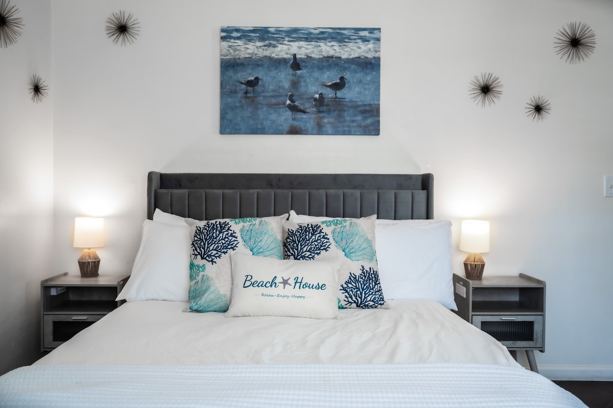 Preciós, nou i completament reformat apartament estudi a dues illes de la platja. Unitat de segona planta, reformada de dalt a baix, dissenyada professionalment. Lloc de vacances perfecte, a peu de la platja, restaurants locals i bars. L'amfitrió és un amfitrió establert de 5 estrelles a Airbnb. Cadires de platja, tovalloles i nevera. La unitat és molt tranquil·la per a aquesta ubicació activa a la platja amb aïllament acústic millorat. L'aparcament fora de la via pública està disponible exclusivament per a Airbnb.