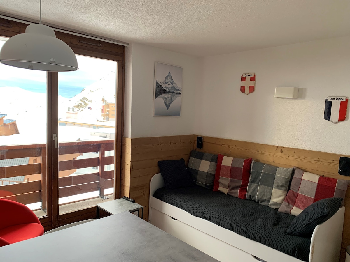 PIS NOU A VAL THORENS! Resort, esquí, esquí, taquilla d'esquí, sortida d'esquí, tornada a l'esquí Encantador estudi petit de 18 m2 molt ben equipat. - Cuina: rentaplats, forn, microones, bullidor, nevera gran, campana extractora, placa de cuina d'inducció. - Sala d'estar: sofà llit amb somier doble (160 cm), wifi, televisor intel·ligent, televisor IP. Résidence la Roche Blanche a 50 m de la Place Caron. Ofereix llençols i tovallola de bany.