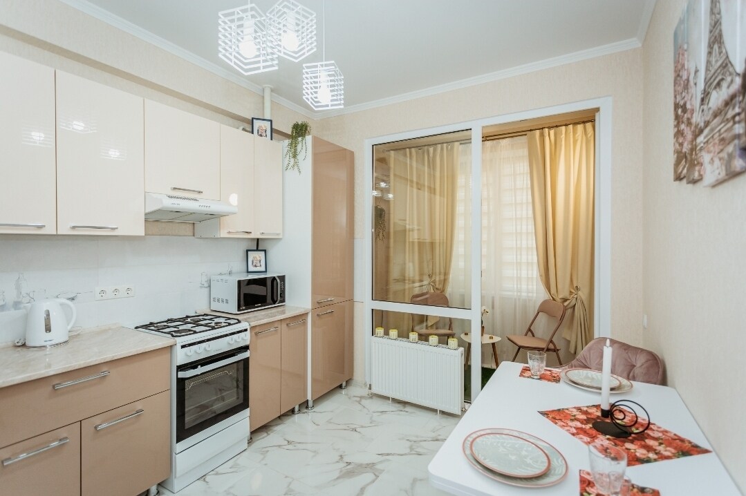 Un apartament espaiós i molt elegant ideal per a aquells que volen gaudir de la tranquil·litat de la ciutat lluny del soroll i el bullici, però situat alhora en una zona que té tot el necessari per a una estada còmoda: supermercats, restaurants, botigues, entreteniment i altres. L'apartament és absolutament nou, equipat amb tot el necessari per gaudir d'una estada còmoda. El seu disseny es va treballar juntament amb un dissenyador, cosa que el fa especial i familiar.