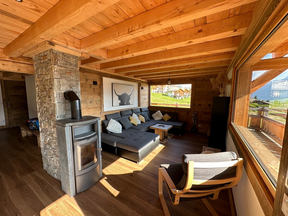 Grand chalet panoramique (190m2) face au Mont Blanc et proche d'un lac de baignade. Classé 4 épis. 4 chambres spacieuses (literie en 3*160cms et 2*90cms). 3 salles de bain dont 2 avec grande douche italienne et 1 avec baignoire. Sauna traditionnel avec vue panoramique par son hublot géant, vrai moment de détente et de récupération après l'effort ! Home Cinema - Babyfoot BONZINI - Enceinte CABASSE- Plancha Gaz etc...